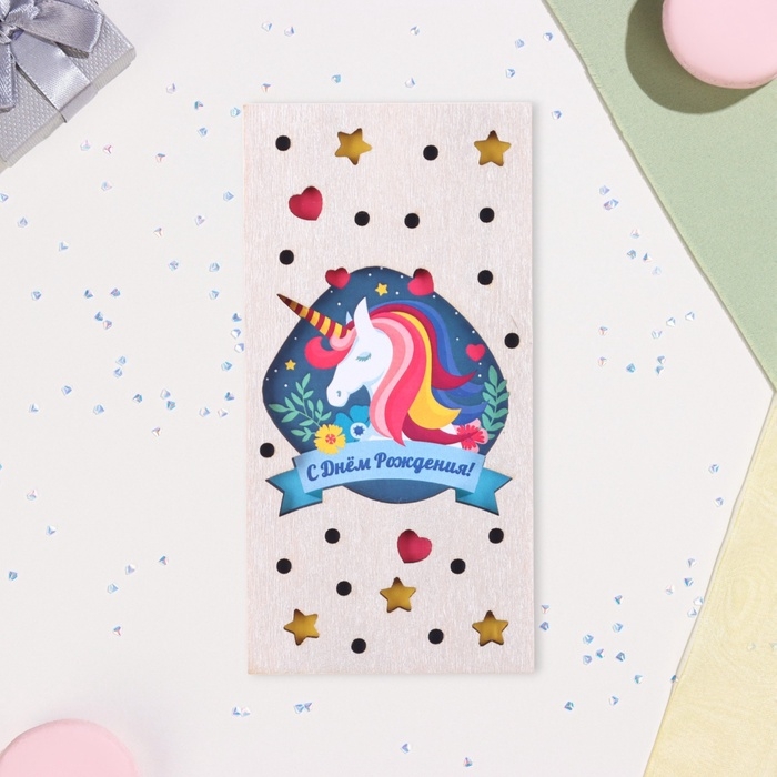 Конверт деревянный резной «С Днём Рождения!» единорог, 8×16 см