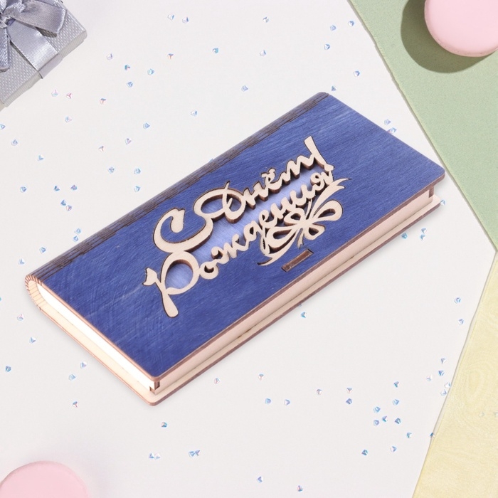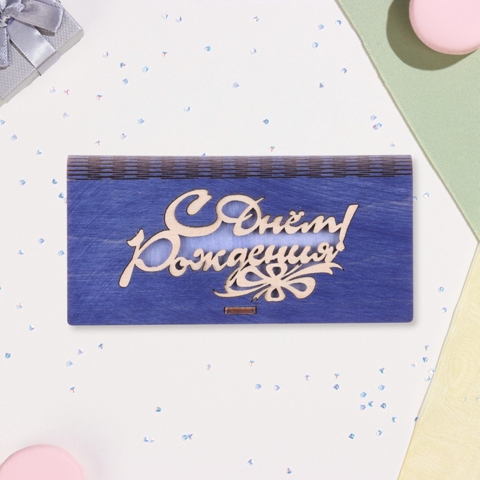 Конверт деревянный «С Днём Рождения!» синий фон, 8,3×17 см