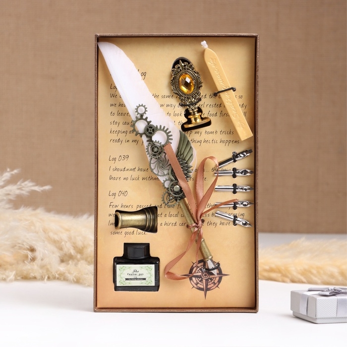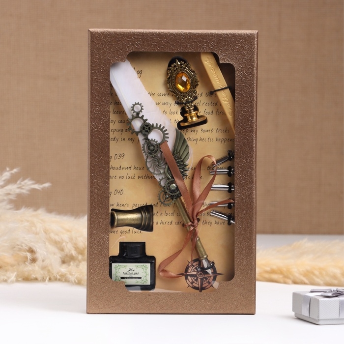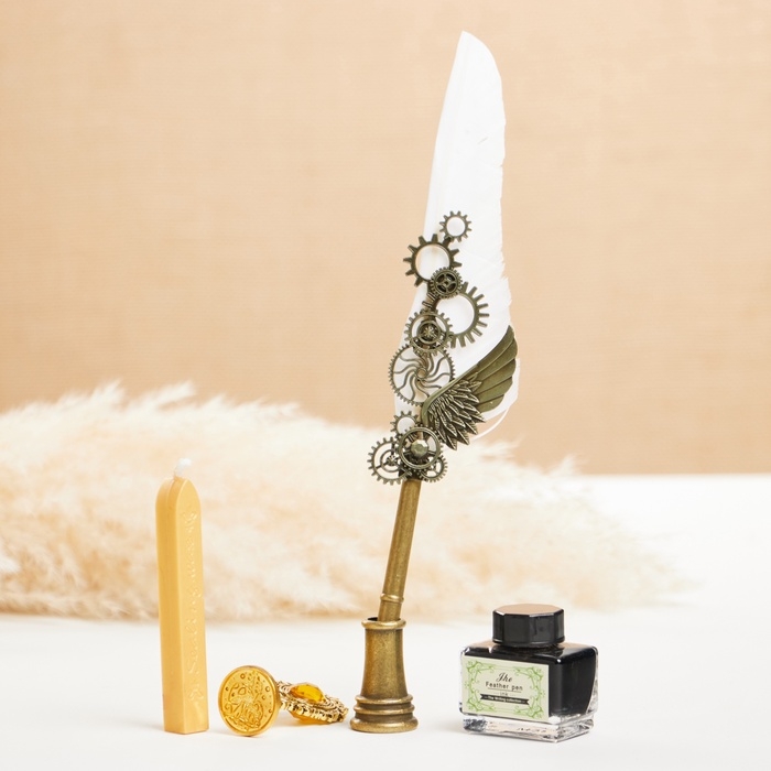 Набор подарочный 5в1 "Стимпанк": перьевая ручка белая, чернила, наконечники, печать, воск