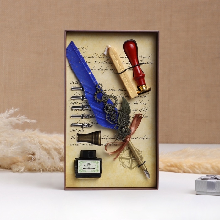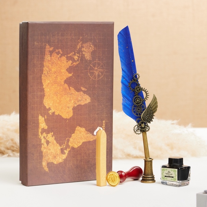 Набор подарочный 5в1 "Стимпанк": перьевая ручка синяя, чернила, наконечники, печать, воск