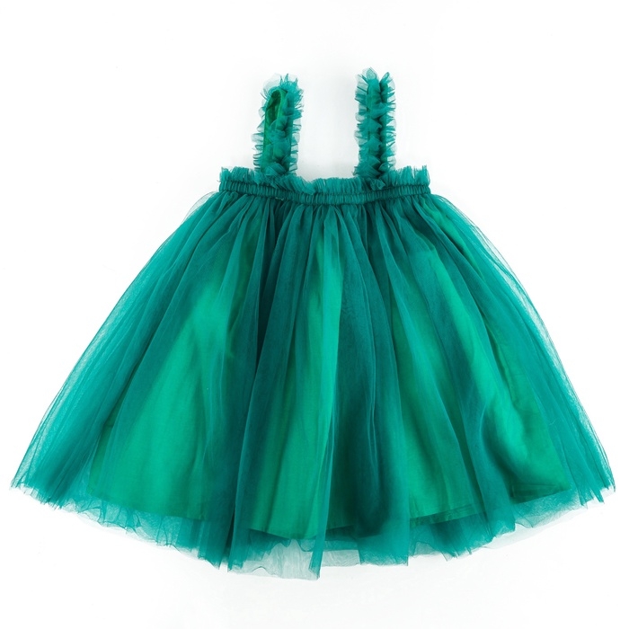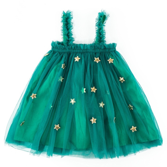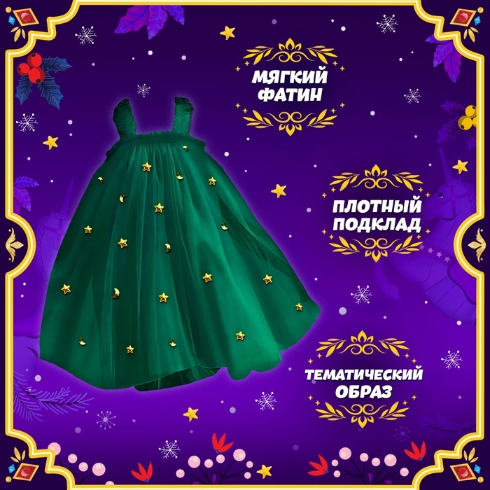 - Платье: Пышное платье изумрудного цвета украшено золотыми звездочками. Платье изготовлено из мягкой и приятной к телу ткани, что обеспечивает комфорт ребёнку во время праздника.