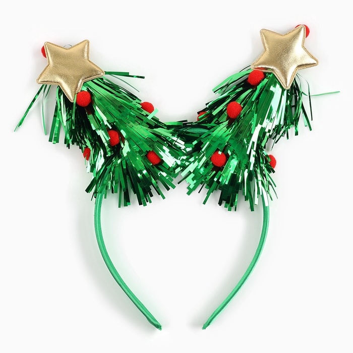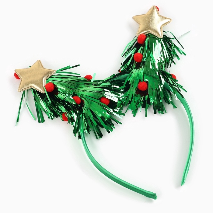 - Ободок: Яркий зелёный ободок украшен двумя ёлочками с золотыми звёздами. Ободок надёжно фиксируется на голове и не доставляет дискомфорта.