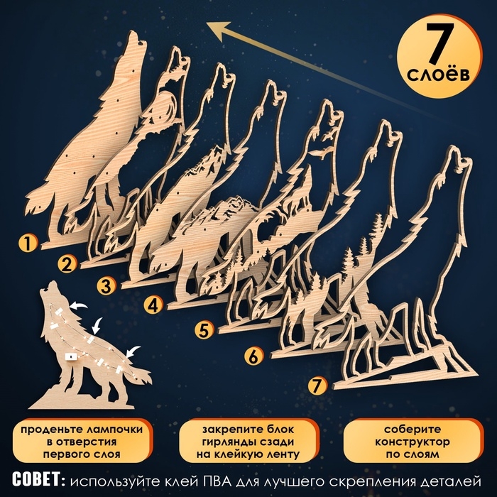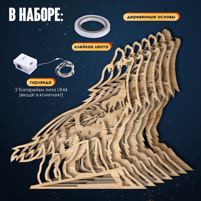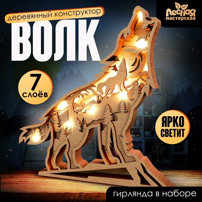 Деревянный конструктор «Волк», размер 21х20 см, гирлянда в комплекте