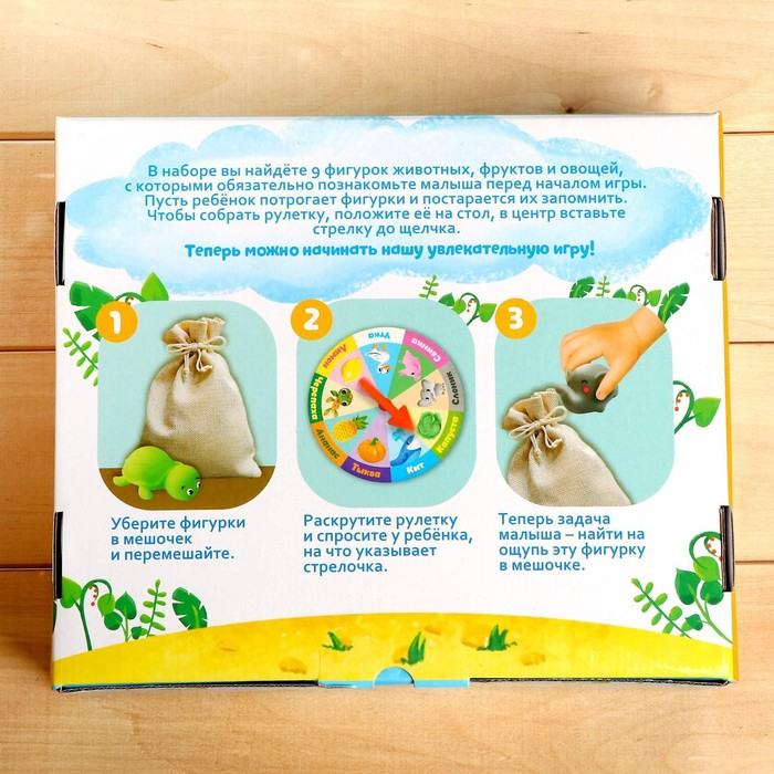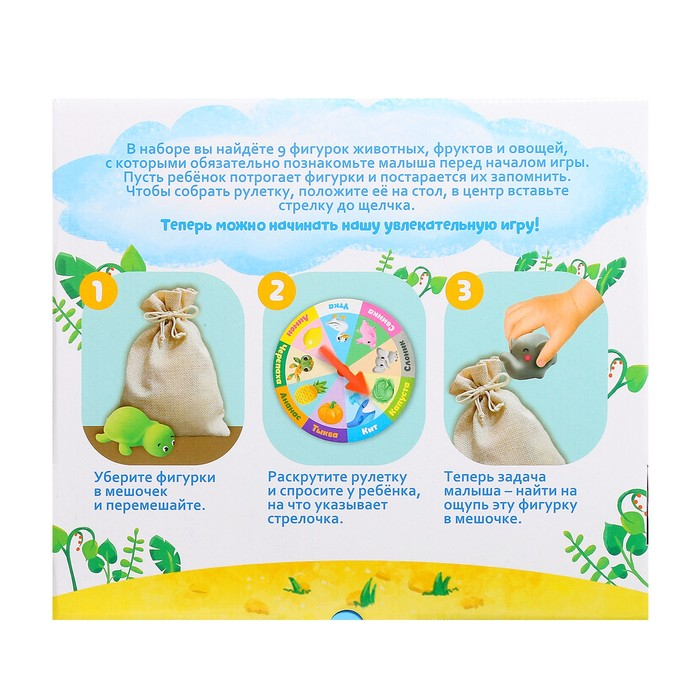 В наборе вы найдёте 9 фигурок животных, фруктов и овощей. Познакомьте малыша с ними перед началом игры.