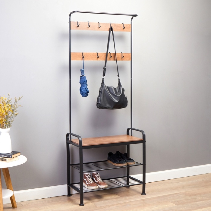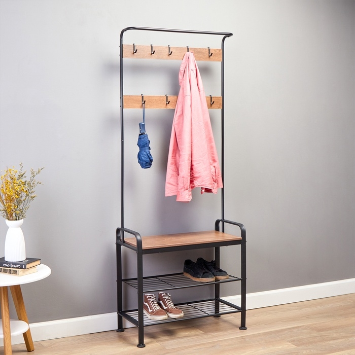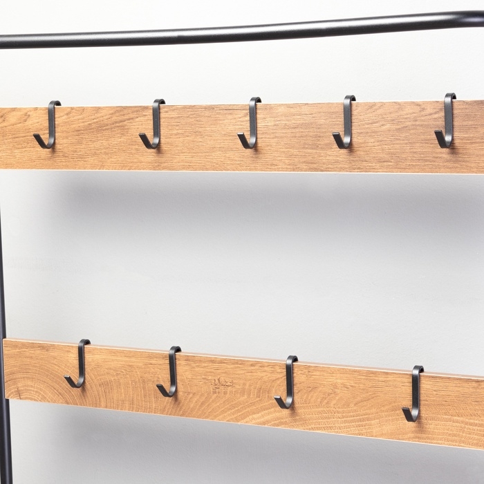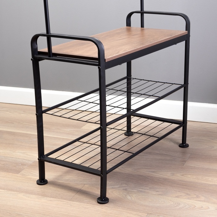 Прихожая София – стильное и функциональное решение для Вашего дома. Металлическая вешалка для одежды с использованием дерева от пола до потолка включает в себя прочные крючки, удобное сиденье для переодевания и полки для повседневной обуви. Верхняя часть прихожей подходит для плечиков.