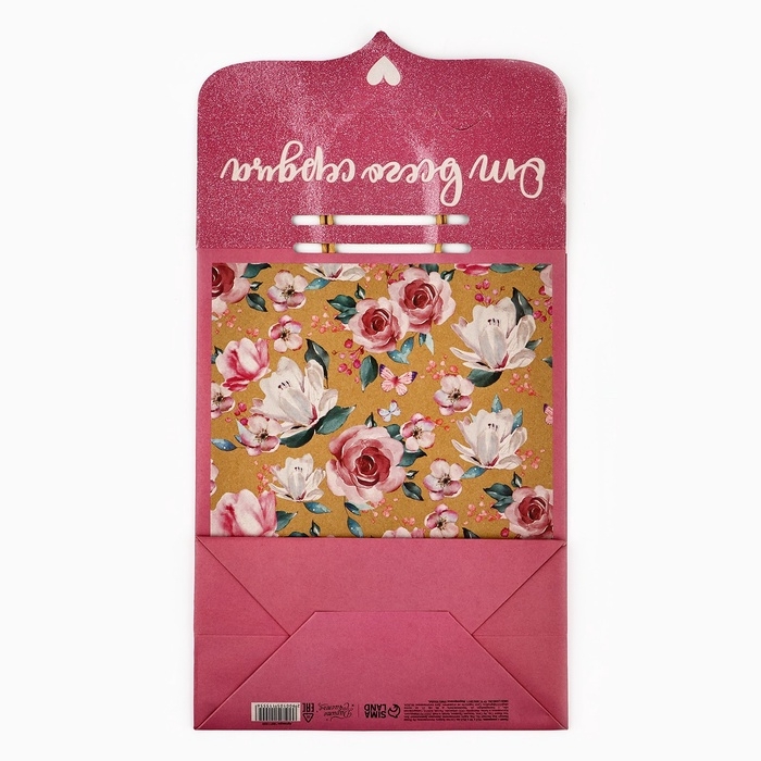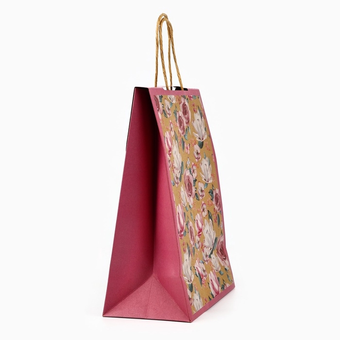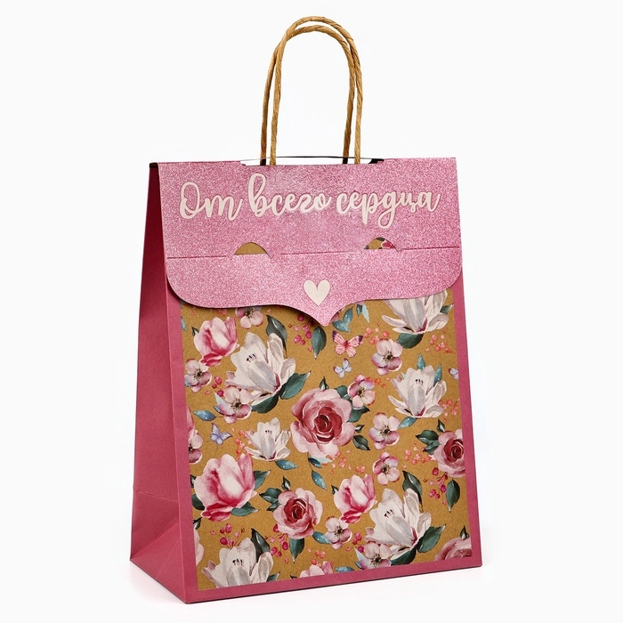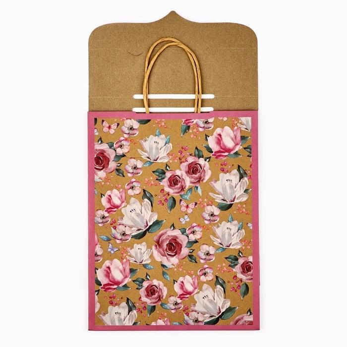 Пакет с клапаном «Цветы», крафт, глиттер, 19,5 × 10 × 25.2 см