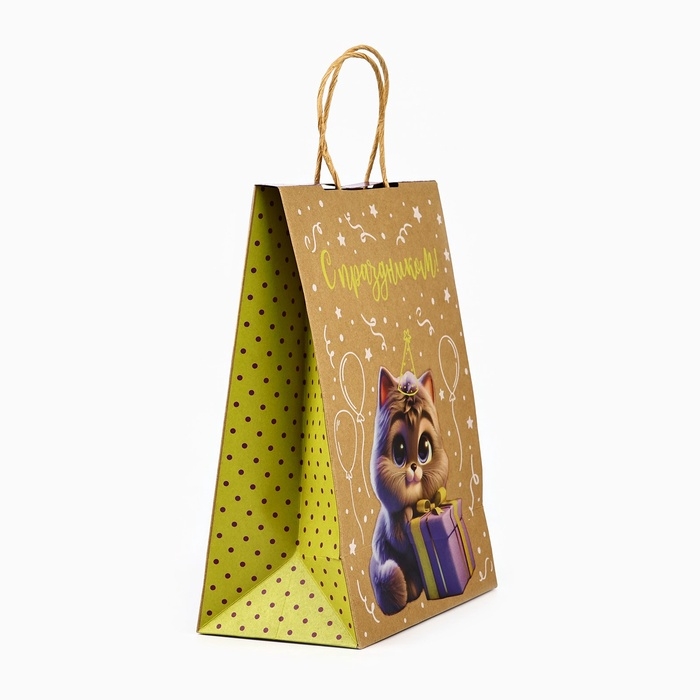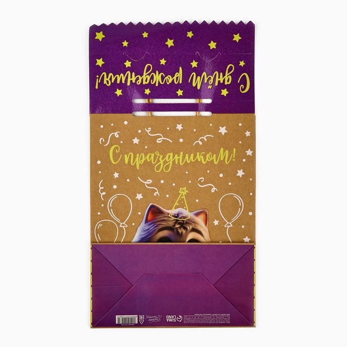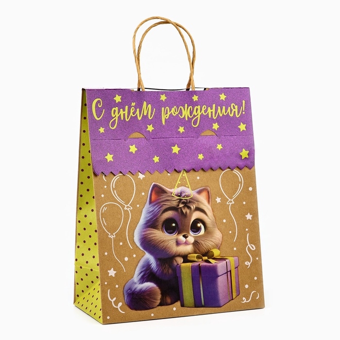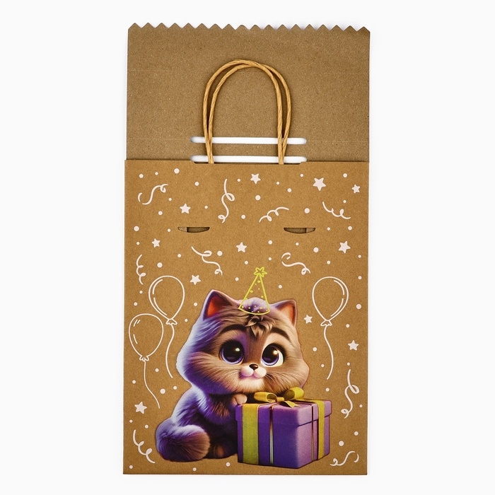 Пакет с клапаном «С Днём рождения», котик, крафт, глиттер, 19,5 × 10 × 25.2 см