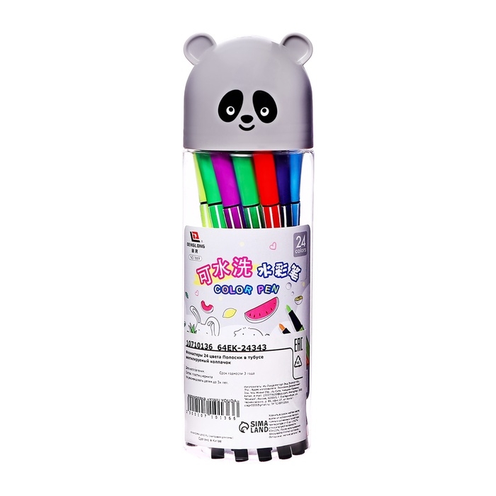 Фломастеры 24 цвета Полоски в тубусе вентилируемый колпачок, Панда серая