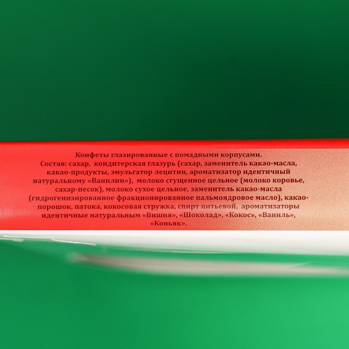 Состав: сахар, кондитерская глазурь (сахар, заменитель какао-масла, какао-продукты, эмульгатор лецитин, ароматизатор идентичный натуральному «Ванилин»), молоко сгущённое цельное (молоко коровье, сахар-песок), молоко сухое цельное, заменитель какао-масла (гидрогенизированное фракционированное пальмоядровое масло), какао-порошок, патока, кокосовая стружка, спирт питьевой, ароматизаторы идентичные натуральным «вишня», «шоколад», «кокос», «ваниль», «коньяк».