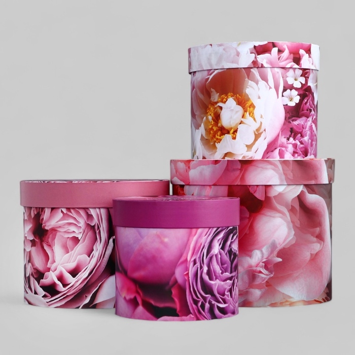 Набор шляпных коробок для цветов 4 в 1, упаковка подарочная, «Пионы», 20 х 17,5 - 16 х 14 см