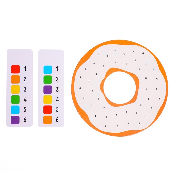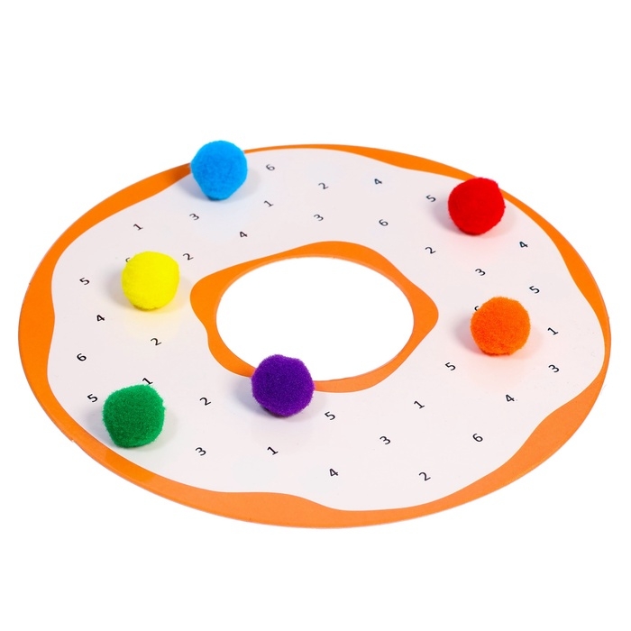 - Попросите малыша найти цифру с кубика на пончике, а затем накрыть её бомбошкой выпавшего цвета.