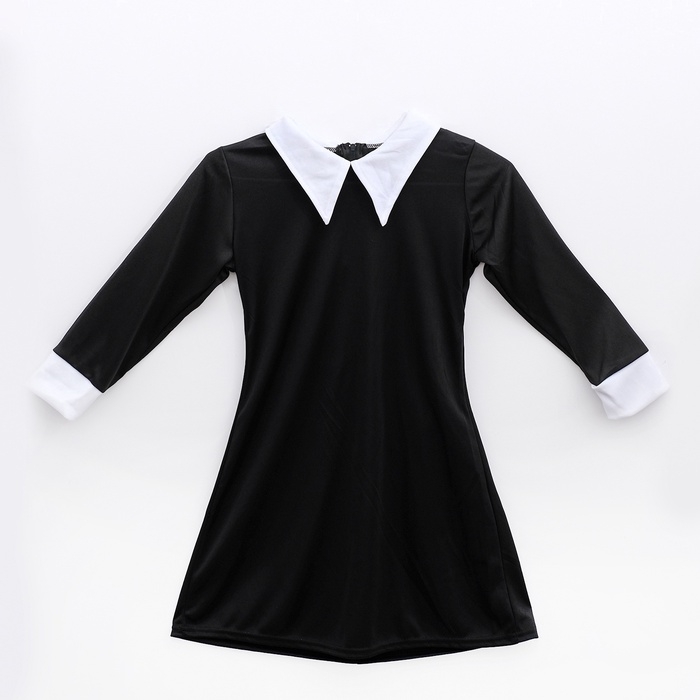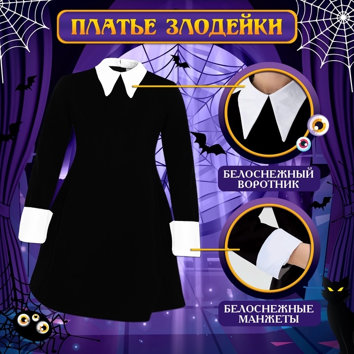 - Платье — элегантное чёрное платье с контрастным белым воротником. Идеальная основа для создания загадочного образа.