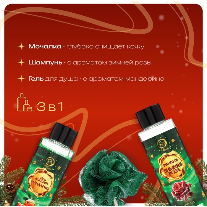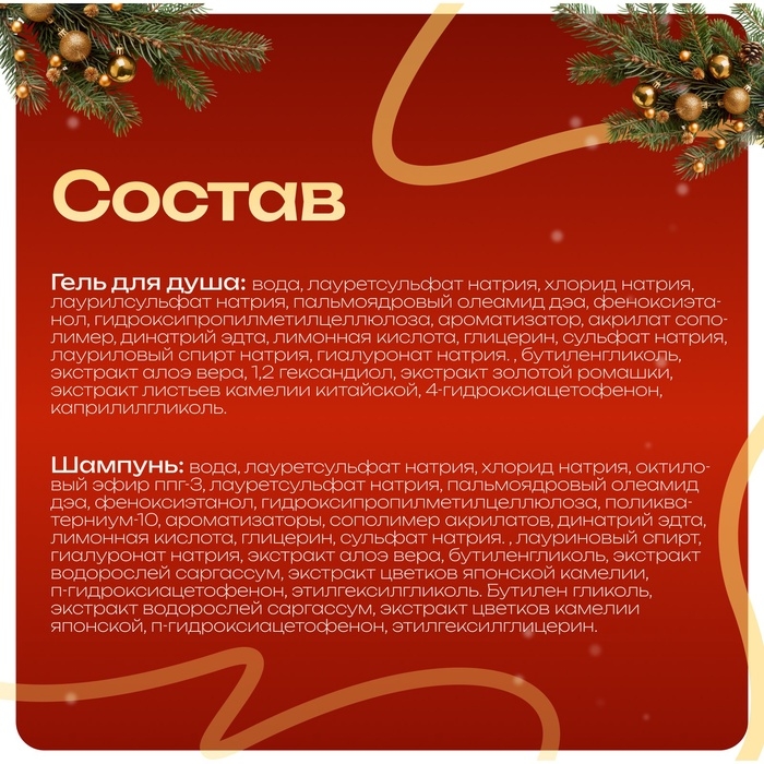 - Гель для душа в составе набора обладает нежной текстурой, мягко очищающей кожу и свежим, ароматным шлейфом, создающим атмосферу праздника. Средство увлажняет кожу, даря ей бархатистость и комфорт после каждого использования.