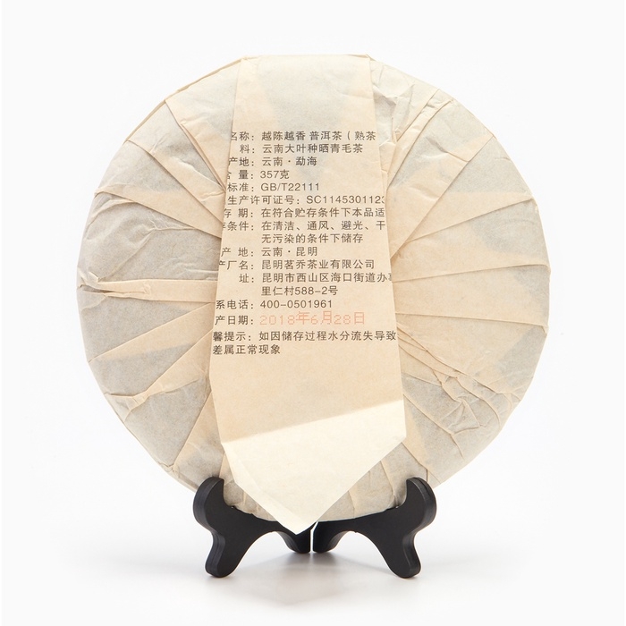 Китайский выдержанный чай «Шу Пуэр. Выдержанный» — это прессованный блин весом 357 г, изготовленный из купажированного сырья 2018 года. Основа — крупнолистовой чай второго сорта из уезда Мэнхай, гора Мэнсун, и «Золотая почка» из округа Линьцан, гора Маан.
