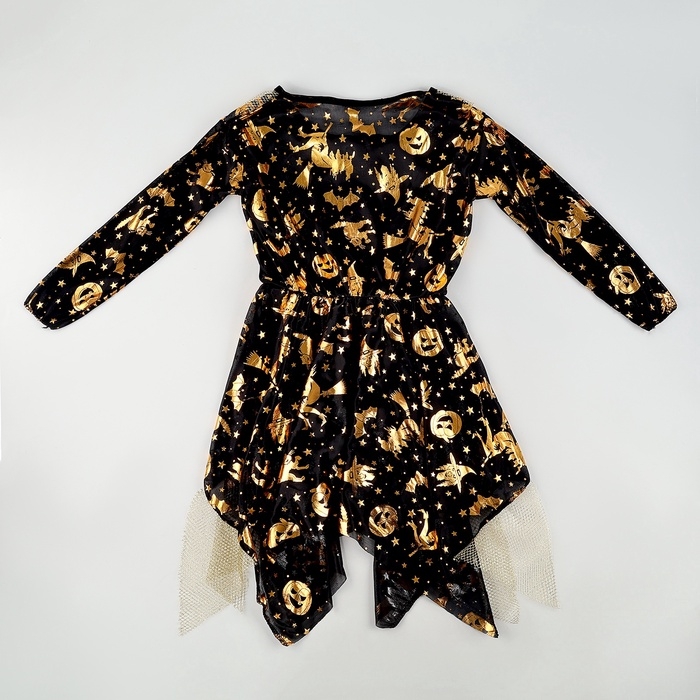- Платье из мягкой ткани чёрного цвета с ярким золотым принтом. Элементы из сетки добавляют образу загадочности.