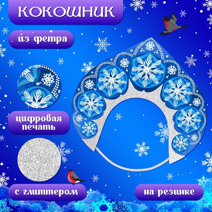 - Кокошник: Украшенный блёстками кокошник на резинке надежно фиксируется на голове и создаёт праздничное настроение.