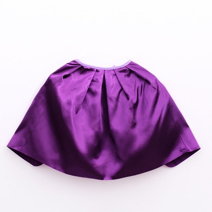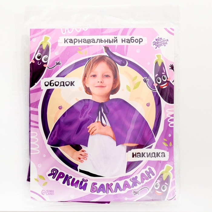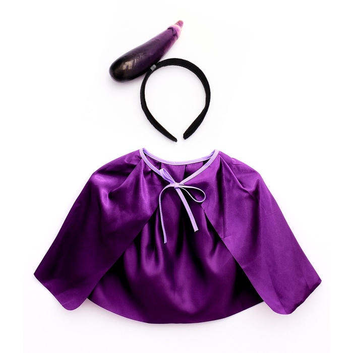 - Накидка. Мягкая и приятная на ощупь накидка из полиэстера фиолетового цвета длинной 40 см. Она легко надевается и фиксируется на шее с помощью завязок. Она создаёт образ спелого баклажана и добавляет образу юного огородника яркости и поднимает настроение.