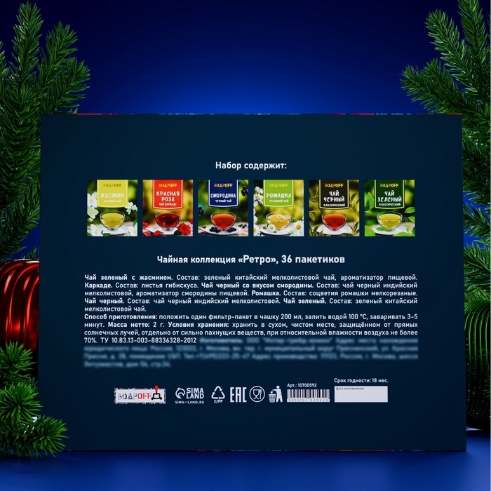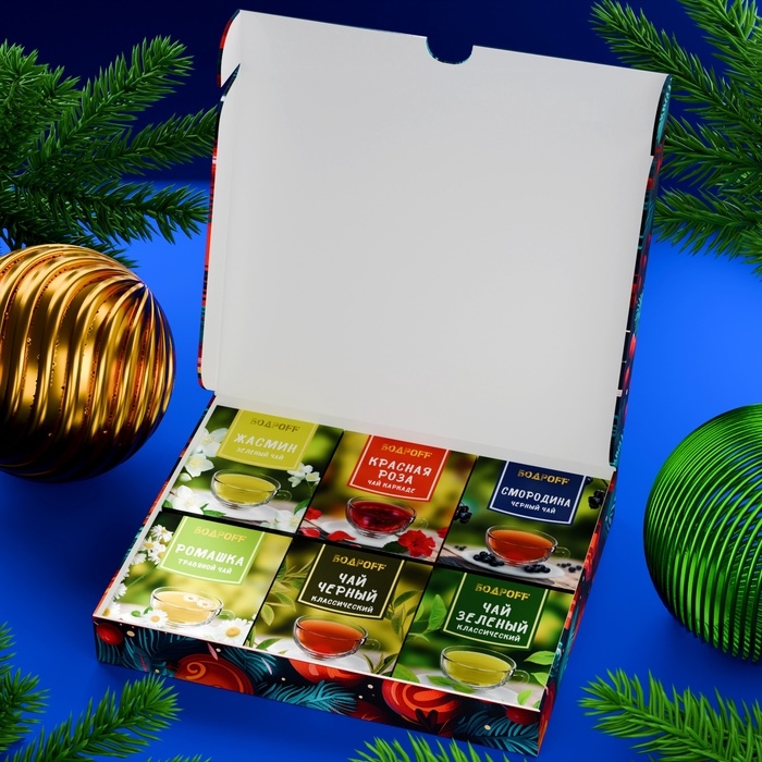 Внутри набора вы найдете 36 пакетиков разнообразного чая, каждый из которых подарит неповторимый вкус и аромат. В этом наборе собраны лучшие сорта чая, которые порадуют даже самых изысканных ценителей. Каждая чашка позволит вам насладиться теплом и уютом, создавая идеальное настроение для встреч с близкими и друзьями.