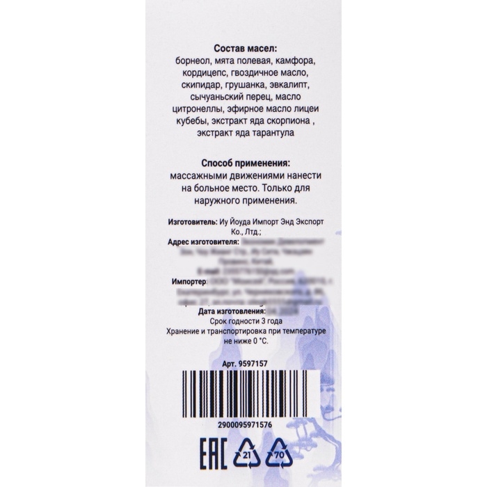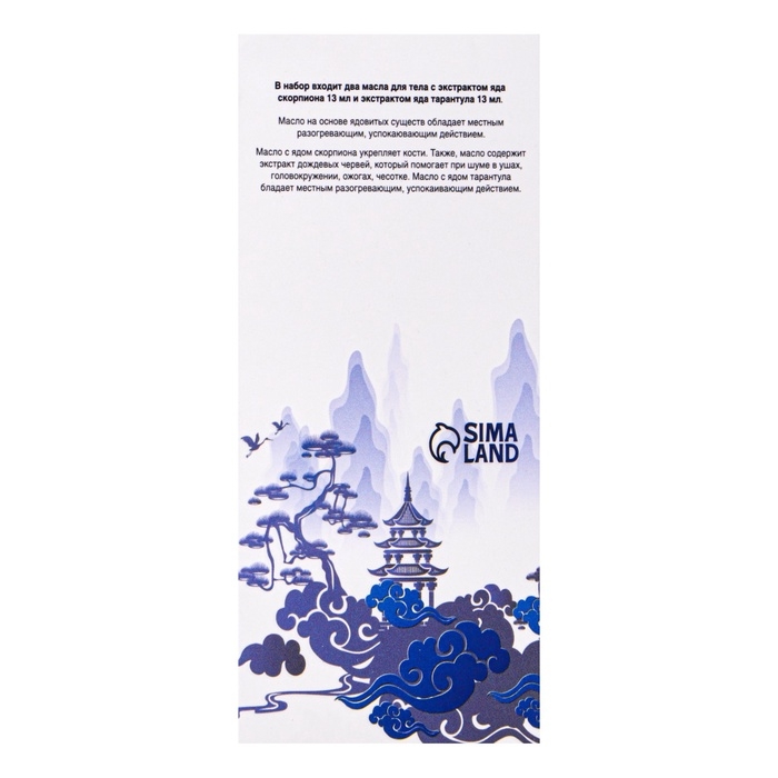 - Масло с ядом тарантула оказывает разогревающее воздействие и способствует расслаблению мышц, обеспечивая дополнительный комфорт и заботу.