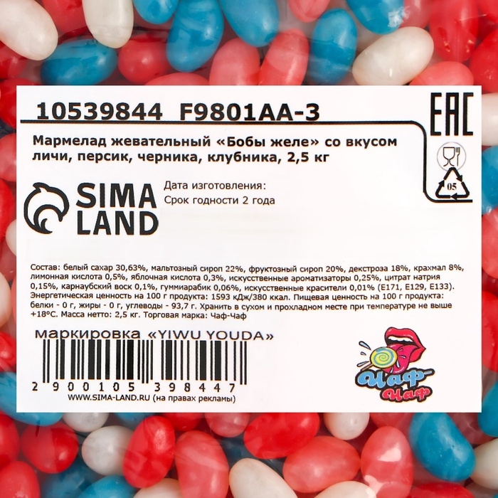 Мармелад жевательный "Бобы желе" со вкусом личи, персик, черника, клубника, 2,5 кг