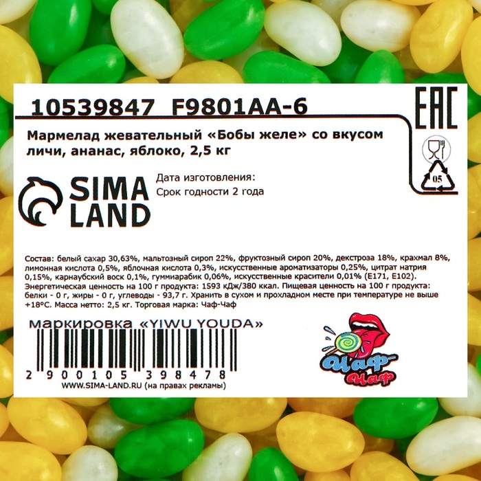 Мармелад жевательный "Бобы желе" со вкусом личи, ананас, яблоко, 2,5 кг