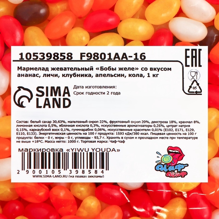 Мармелад жевательный "Бобы желе" со вкусом ананас, личи, клубника, апельсин, кола, 1 кг