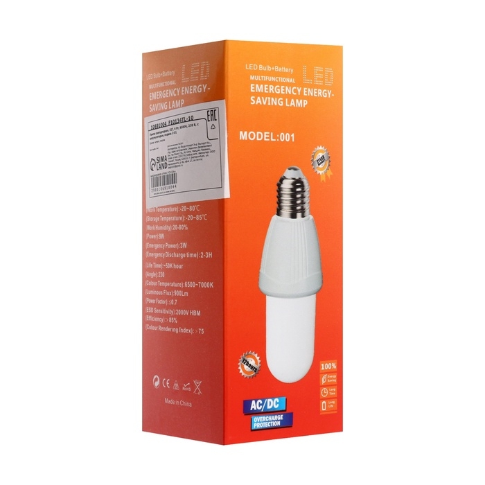Лампа светодиодная, Е27, 6 Вт, 6500К, 220 В, с аккумулятором