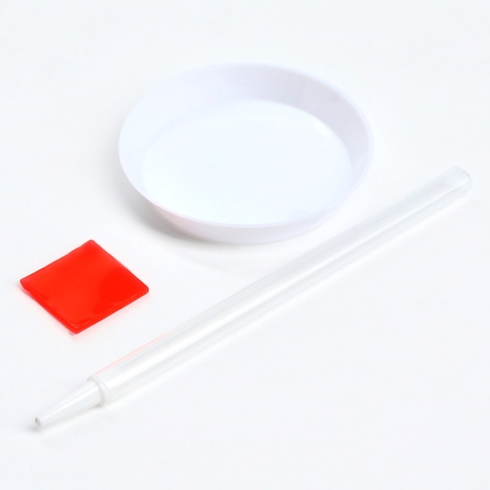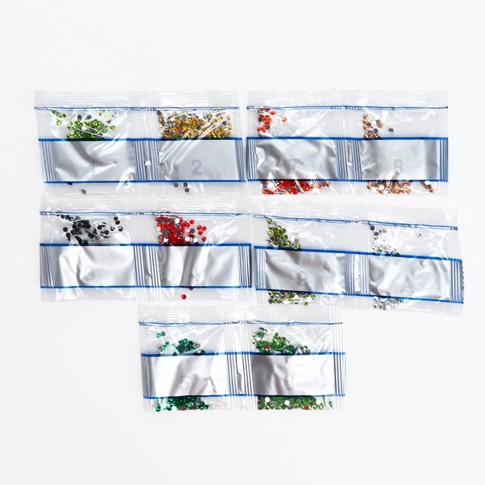 - Из пакетика с номером, который соответствует схеме, отсыпьте в ёмкость немного стразов.