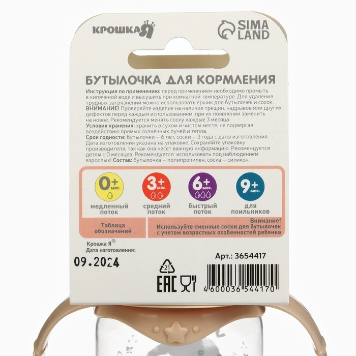 Детская бутылочка изготовлена в России из сырья отечественного производства. Все материалы сертифицированы и безопасны для здоровья новорождённых. Полипропилен и силикон не выделяют вредных веществ при стерилизации и контакте с жидкостью.