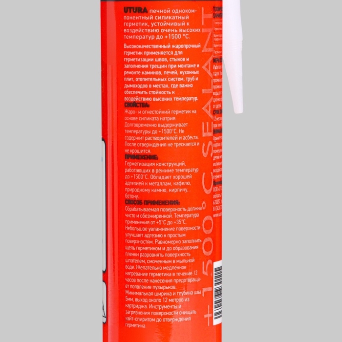 UTURA однокомпонентный силикатный герметик, устойчивый к воздействию очень высоких температур до +1500 °C. Высококачественный жаропрочный герметик применяется для герметизации швов, стыков и заполнения трещин при монтаже и ремонте каминов, печей, кухонных плит, отопительных систем, труб и дымоходов в местах, где важно обеспечить стойкость к воздействию высоких температур. Технические данные Основа: Однокомпонентный силикатный герметик. Цвет: черный Плотность: 1.8 ± 0,01 Температура нанесения: +5 °C до +35 °C Температура эксплуатации: –30°С до +1500°С Время высыхания поверхности: 15 минут. Время отверждения 2 мм за 24 часа. Коэффициент растяжения: 0% Состав Силикат натрия, каолин, диоксид кремния Упаковка 280мл картридж Хранение и срок годности При хранении в оригинальной упаковке в сухом и прохладном месте при температуре +5 °C до +25 °C срок годности продукта составляет 12 месяцев с даты изготовления. В странах с высокой температурой и влажностью специальные условия хранения должны быть созданы. Храните продукт в закрытом, хорошо проветриваемом помещении и избегайте излишних высокотемпературных воздействий.