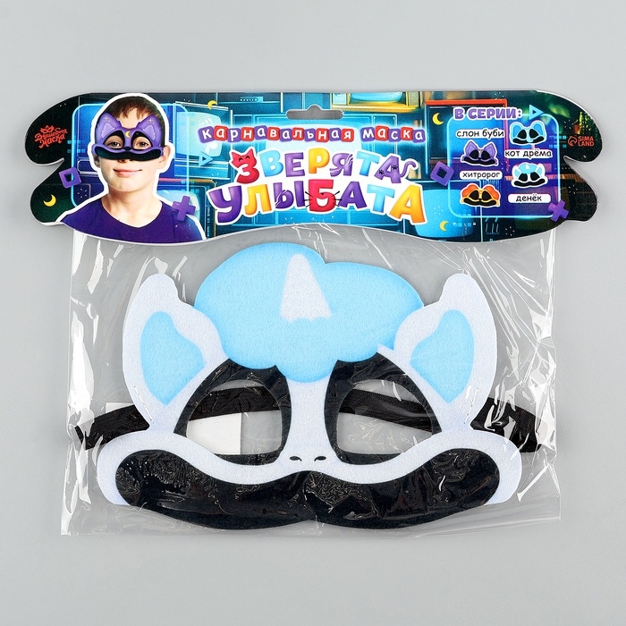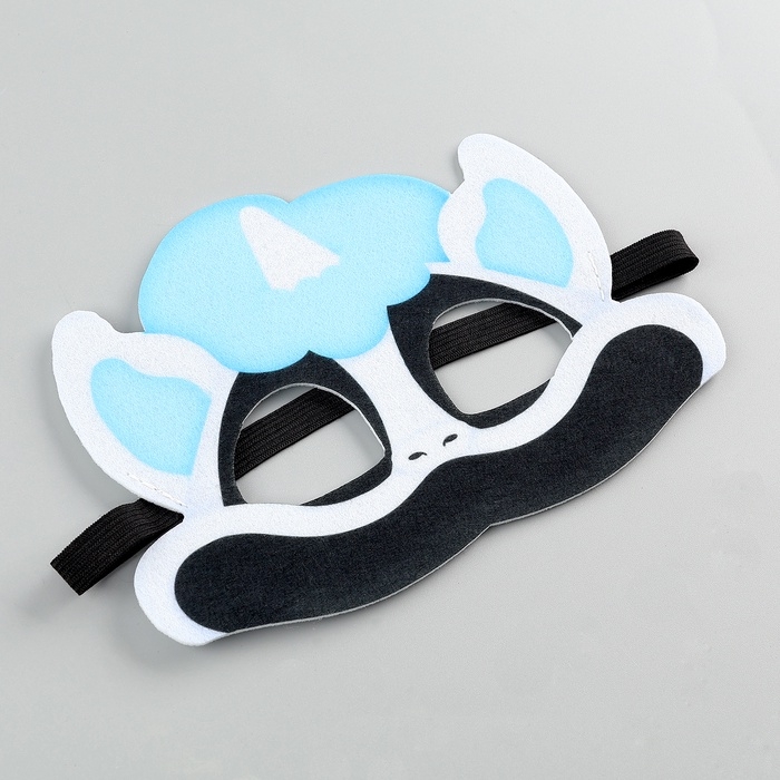 Карнавальная маска «Зверята улыбата. Хитророг» — это милый и оригинальный аксессуар для любого праздника. Маска выполнена из мягкого фетра белых и голубых оттенков и украшена забавной мордочкой единорога. Она надежно фиксируется на голове с помощью резинки.
