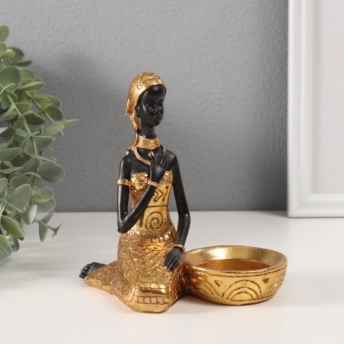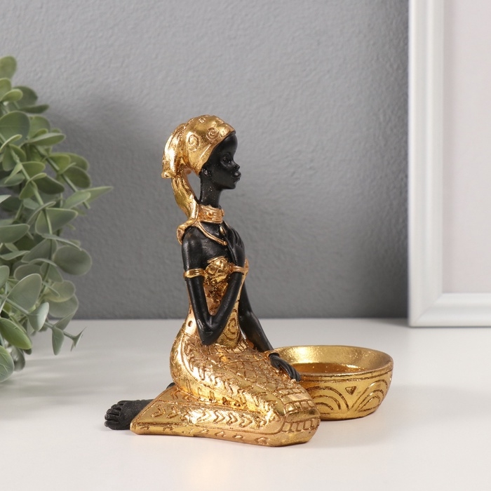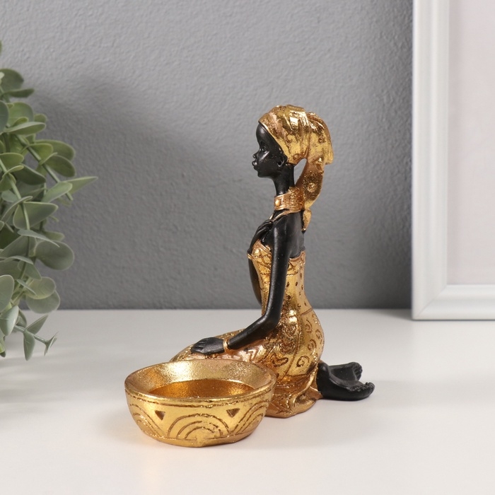 Сувенир полистоун подсвечник"Африканка Рудо в золотом платье у тазика"d=4 см 9,5х12,5х14 см