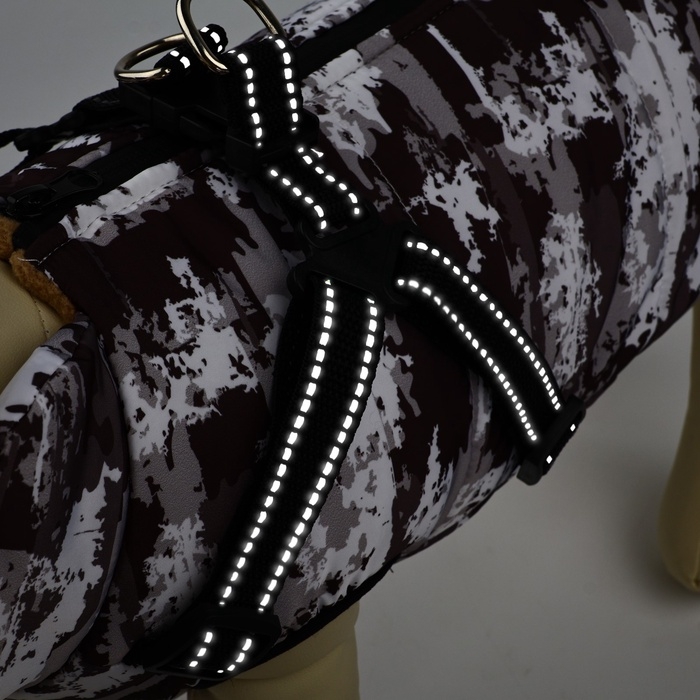 - Металлические крепления для поводка: Куртка оснащена специальными креплениями для поводка, что делает её идеальным выбором для активных прогулок и гарантирует безопасность вашего питомца.