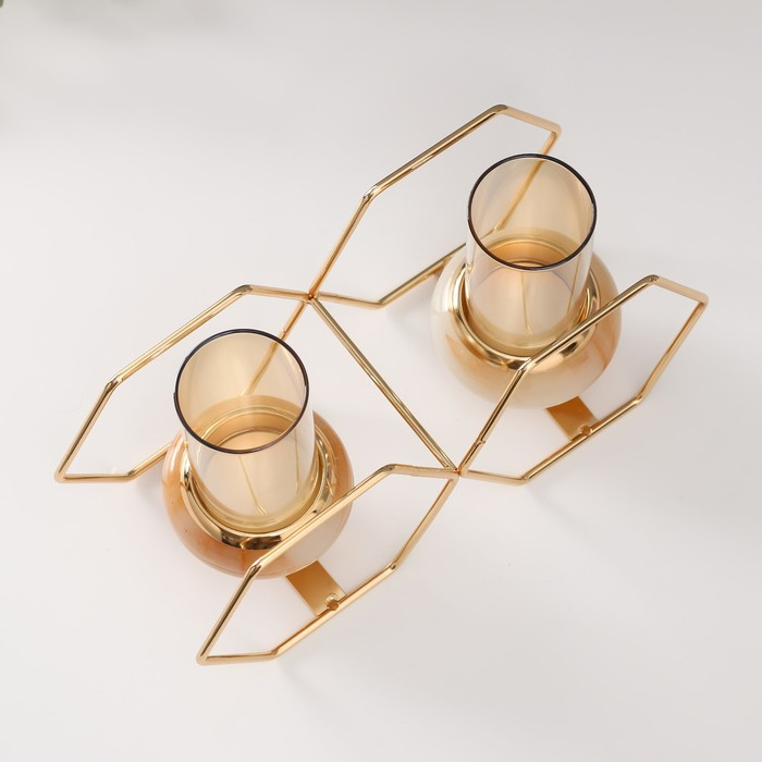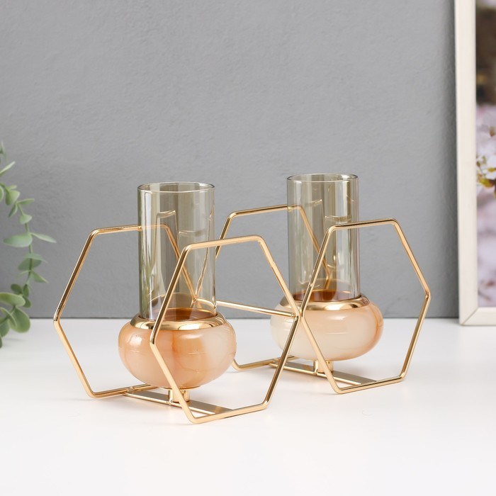 Подсвечник металл, стекло на 2 свечи "Шестигранники" белый с золотом 15,5х26,5х10,5 см