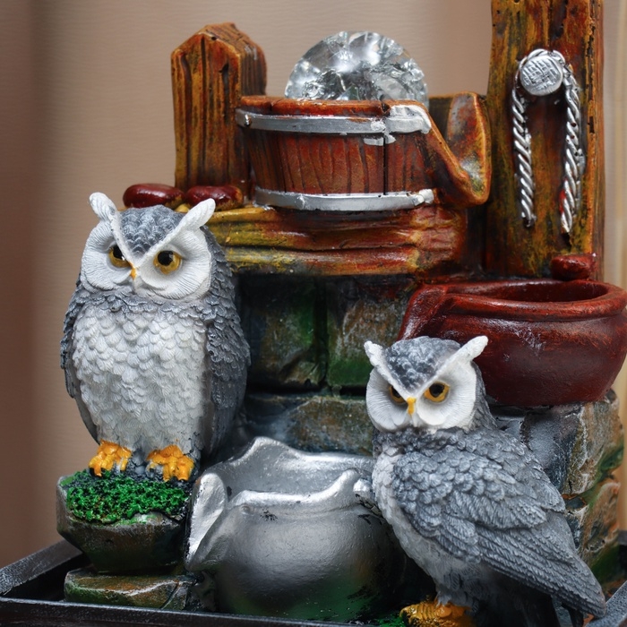 Фонтан "Семья серых филинов на камнях" 28х21 см (с подсветкой)
