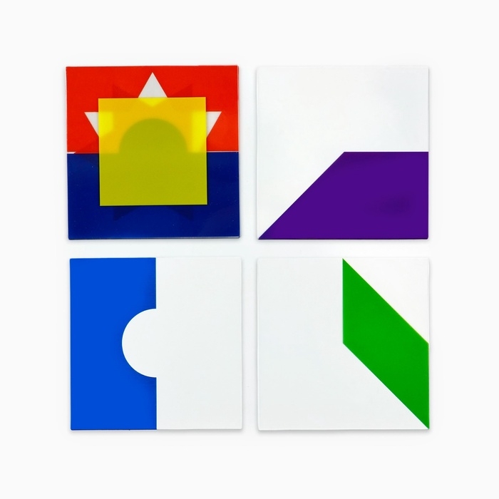 Перед вами увлекательная головоломка - выбирайте 1 из 100 заданий и берите в руки цветные поля. Накладывайте эти поля с геометрическими фигурами друг на друга так. чтобы получилась такая же картинка, как и в задании.