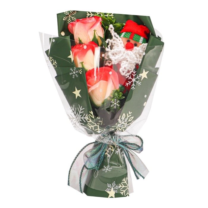 - Элегантный букет из мыльных красных роз, каждую из которых отличает тщательно проработанная деталь и насыщенный цвет. В композиции присутствует фигурка Деда Мороза, добавляющая новогоднюю атмосферу.