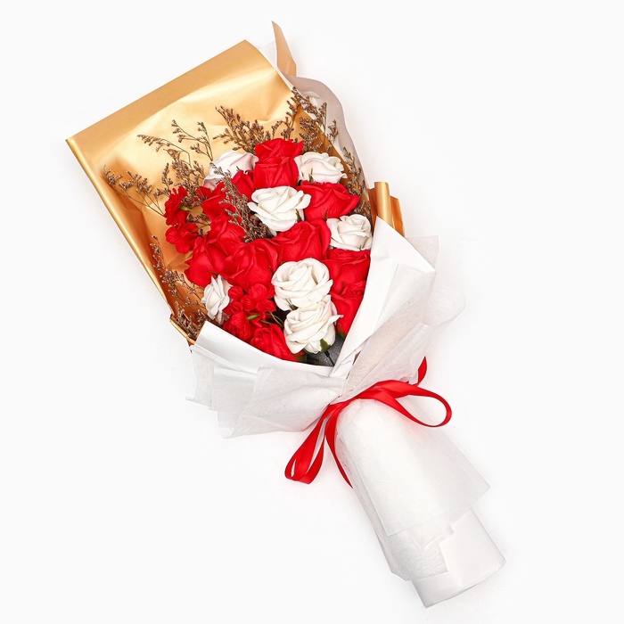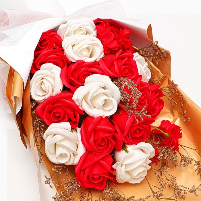Состоит из 20 роскошных цветов, выполненных из мыльного материала, который внешне не отличим от живых бутонов. Прекрасный выбор как для украшения интерьера, так и для оригинального презента, который сохранит свою красоту и символику на долгие годы.