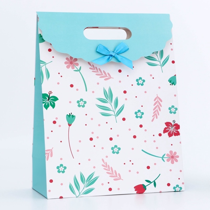 Подарочная коробка-пакет, упаковка с вырубной ручкой, "Голубые цветочки" , 24 х 12 х 31 см