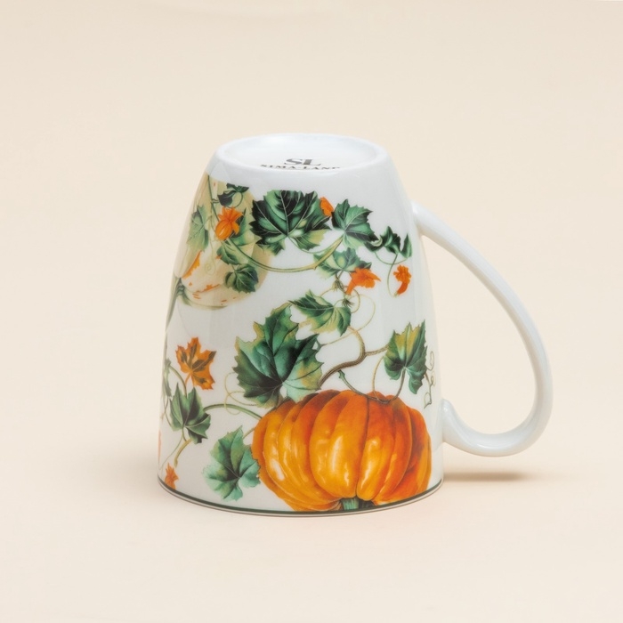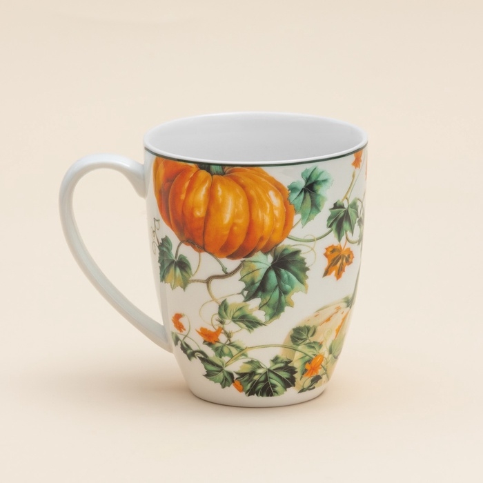 Изготовленная из качественного фарфора, эта кружка порадует вас ровным белым цветом и гладкой текстурой. Особенно привлекательным её делает оригинальный осенний рисунок с овощами, который привнесет праздничное настроение в любую осеннюю встречу.