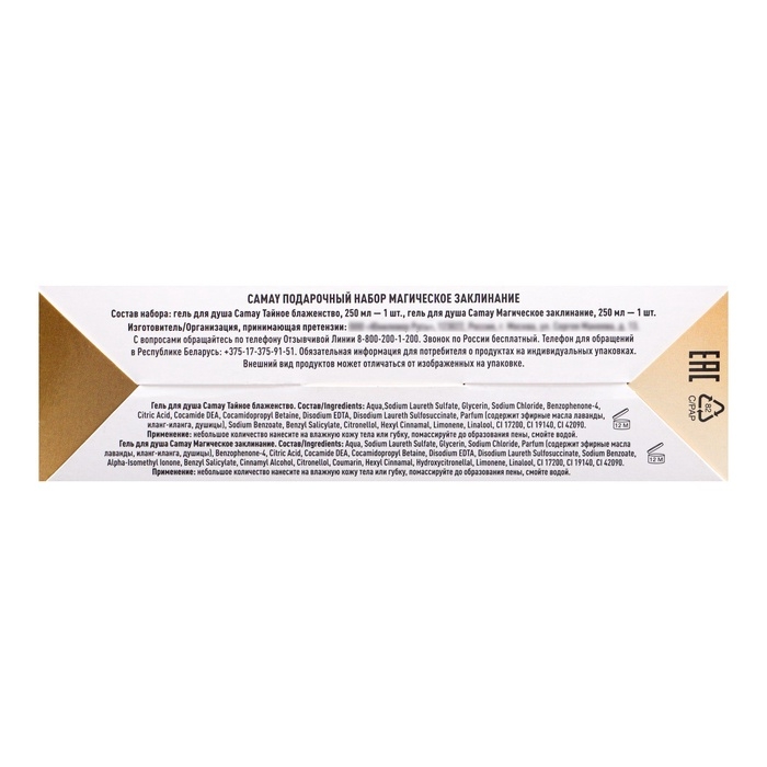 - Гель для душа Camay Магическое заклинание: Aqua, Sodium Laureth Sulfate, Desamido Collagen (дезамидо коллаген), Inulin, Prunus Amygdalus Dulcis (Sweet Almond) Oil (миндальное масло), Punica Granatum Fruit Juice (экстракт граната), Salvia Officinalis (Sage) Leaf Extract, Sodium Hyaluronate, Benzophenone-4, Citric Acid, Cocamide DEA, Cocamidopropyl Betaine, Disodium EDTA, Disodium Laureth Sulfosuccinate, Glycerin, Parfum, Sodium Benzoate, Sodium Chloride, Sodium Hyaluronate, Tocopherol, Alpha-Isomethyl Ionone, Benzyl Salicylate, Citronellol, Limonene, CI 17200.