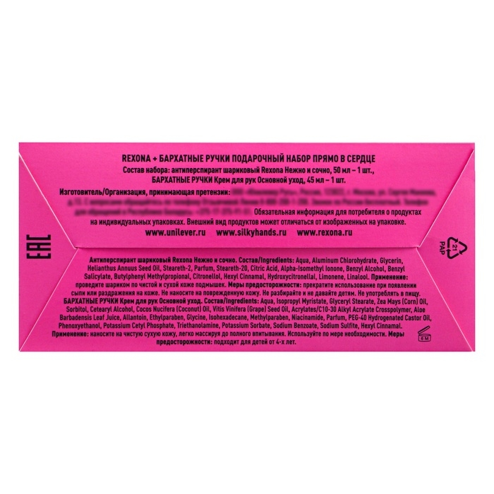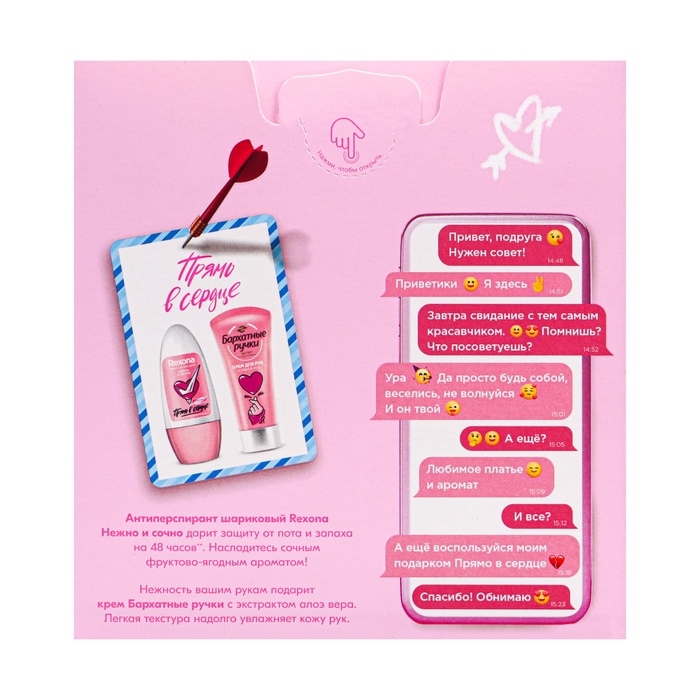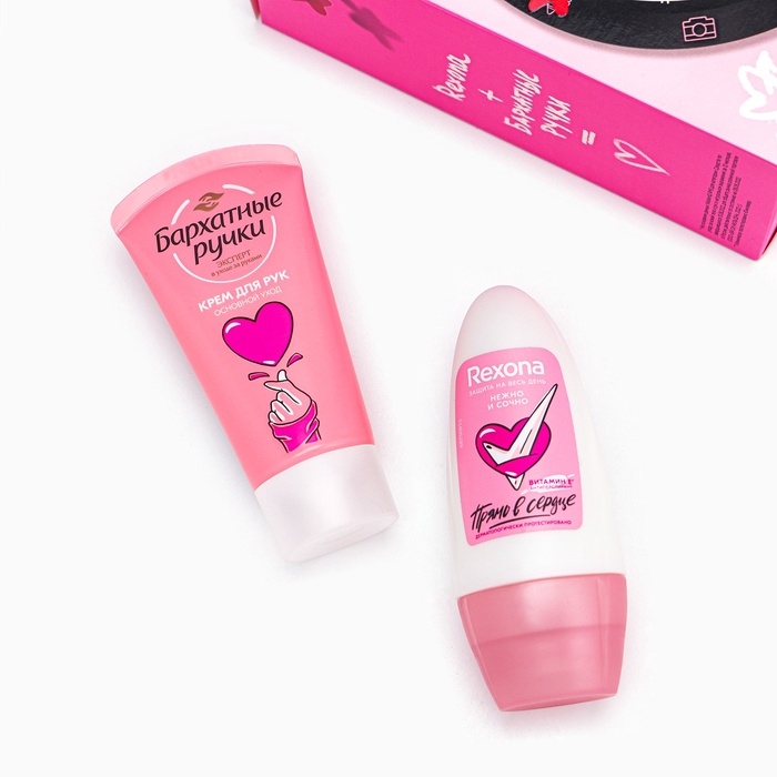 Подарок для юной и прекрасной, который порадует и пригодится – набор Прямо в сердце от брендов Rexona и Бархатные ручки! Стильная упаковка в розовом цвете и привлекательные ароматы продуктов доставят особое удовольствие во время использования.