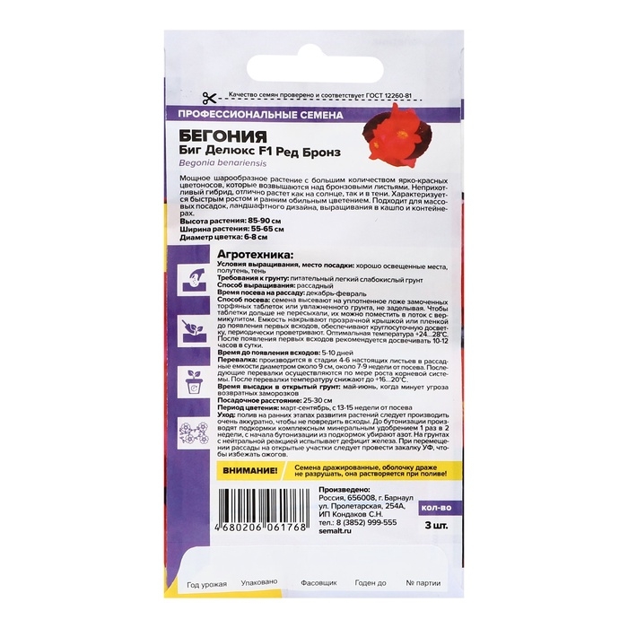 Семена цветов Бегония Биг Делюкс F1 Ред бронз, ц/п, 3 шт.