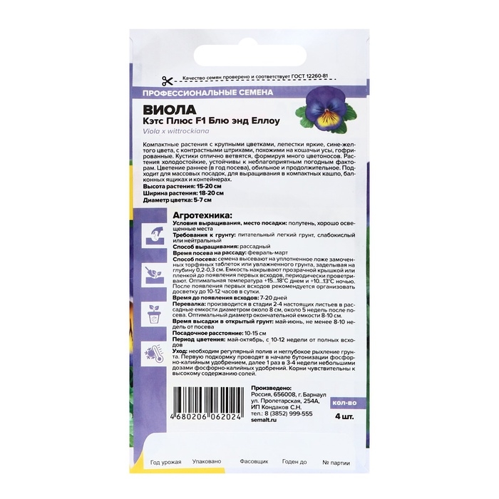 Семена цветов Виола Кэтс Плюс F1 Блю энд Еллоу, ц/п, 4 шт.