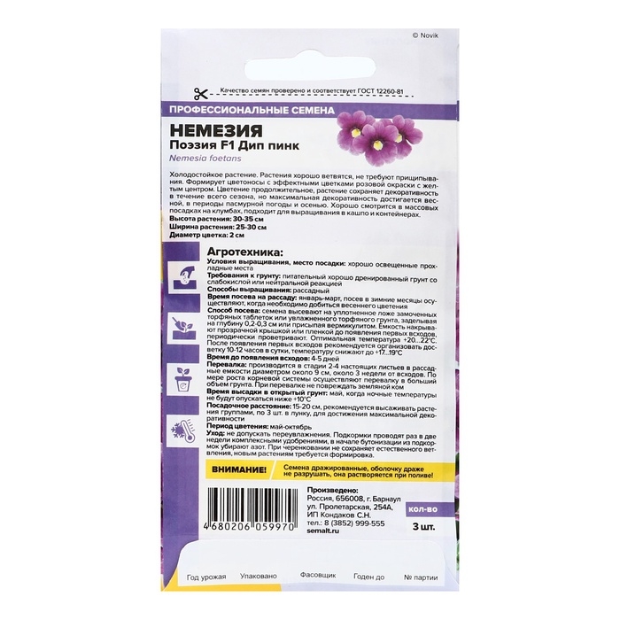 Семена цветов Немезия "Поэзия" F1 Дип пинк, ц/п, 3 шт.