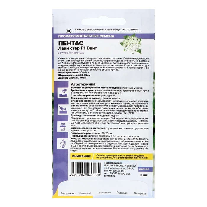 Семена цветов Пентас "Лаки стар" F1 Вайт ланцетовидный, ц/п, 3 шт.