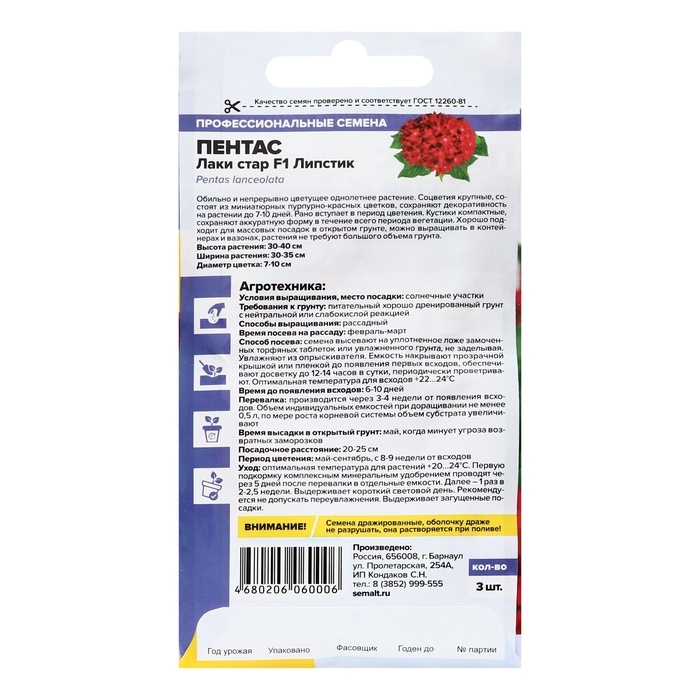 Семена цветов Пентас "Лаки стар" F1 Липстик ланцетовидный, ц/п, 3 шт.