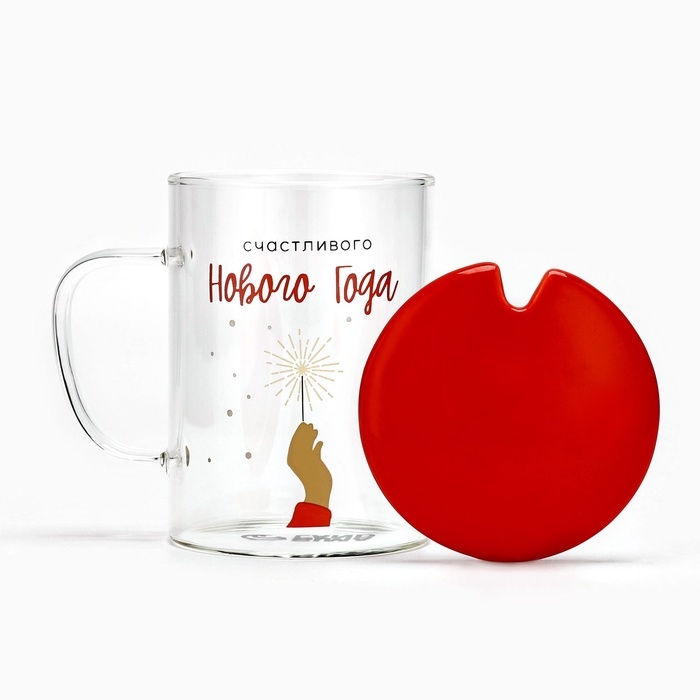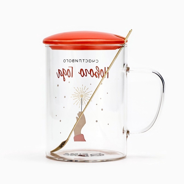 Кружка с ложкой и крышкой стеклянная Дорого внимание «Счастливого Нового года», 470 мл