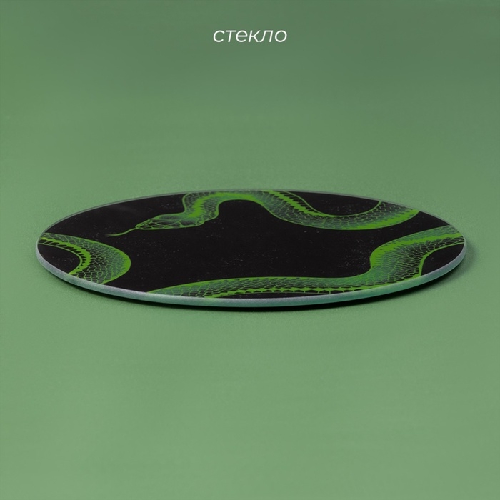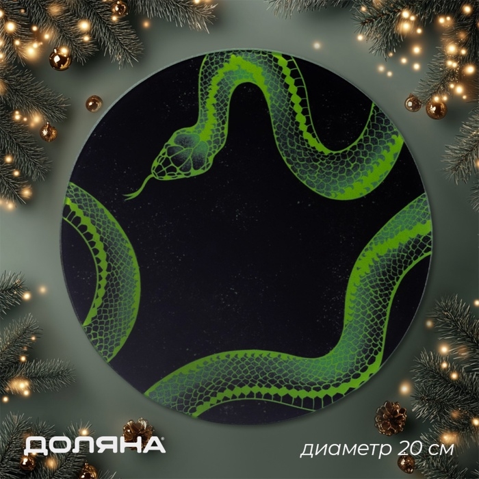 С диаметром 20 см и выполненная из качественного стекла, доска представляет собой идеальный выбор для резки свежих ингредиентов, а ее стильный черный цвет с уникальным новогодним рисунком в виде зелёной змеи привлечет внимание и станет предметом восхищения как хозяев, так и гостей вашего дома.