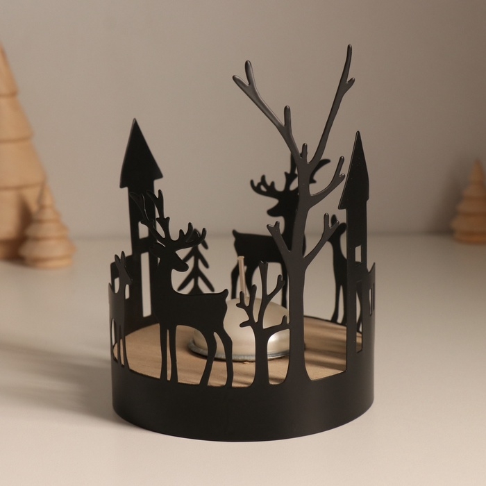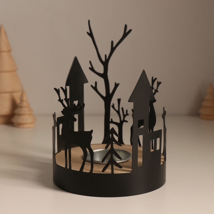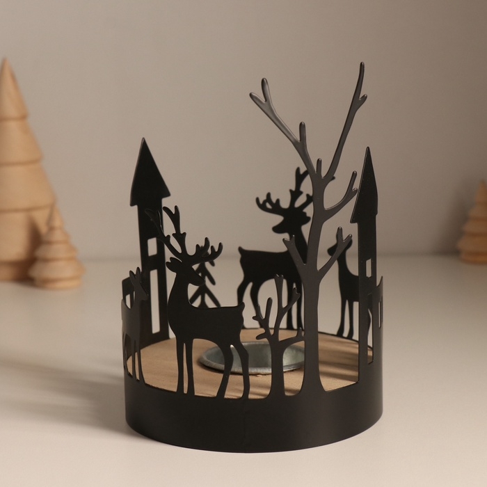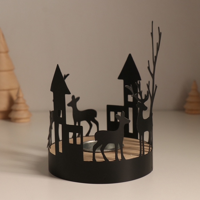 Подсвечник металл, дерево на 1 свечу "Домики и олени" d=4 см 10х10х13,8 см